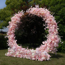 Circle wedding arch decorated with white, pink flowers and greenery outdoors.